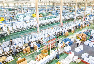 4月25日,在江蘇省宿遷市蘇宿工業(yè)園區(qū)的江蘇皓峰電器有限公司生產(chǎn)車間內(nèi),技術(shù)人員在生產(chǎn)加工銷往海內(nèi)外市場的智能洗衣機。陳少帥攝(人民視覺)