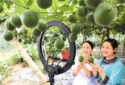 互聯(lián)網(wǎng)平臺互聯(lián)互通,將為電子商務從業(yè)者和消費者帶來更多便利。圖為日前,在貴州省黔東南苗族侗族自治州榕江縣仁里水族鄉(xiāng)通倒村羅漢果種植基地,工作人員在直播推介當?shù)爻霎a(chǎn)的羅漢果。李長華攝(人民視覺)