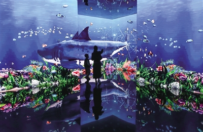 圖為游客在位于濟(jì)南市的山東省美術(shù)館參觀體驗(yàn)“無(wú)限之海”沉浸式AI數(shù)字藝術(shù)展。新華社發(fā)(郝鑫城 攝)
