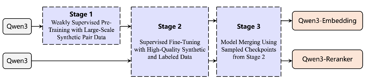 向量模型像是AI的“翻譯器”,它可以將文本、圖片等人類可認知的非結構化信息,映射到機器更易理解的向量空間,再基于這些向量實現高效的信息分類、檢索或排序。也正因此,向量模型對于提升AI的語義理解、信息檢索、多模態(tài)融合等核心能力至關重要?;谇?模型,通義團隊通過對比訓練、SFT、模型融合等方法,打造出全新的千問3向量模型,包含文本嵌入模型 Qwen3-Embedding以及文本排序模型Qwen3-Reranker。