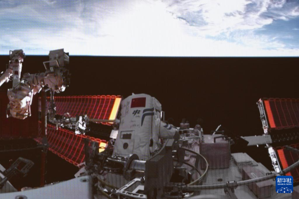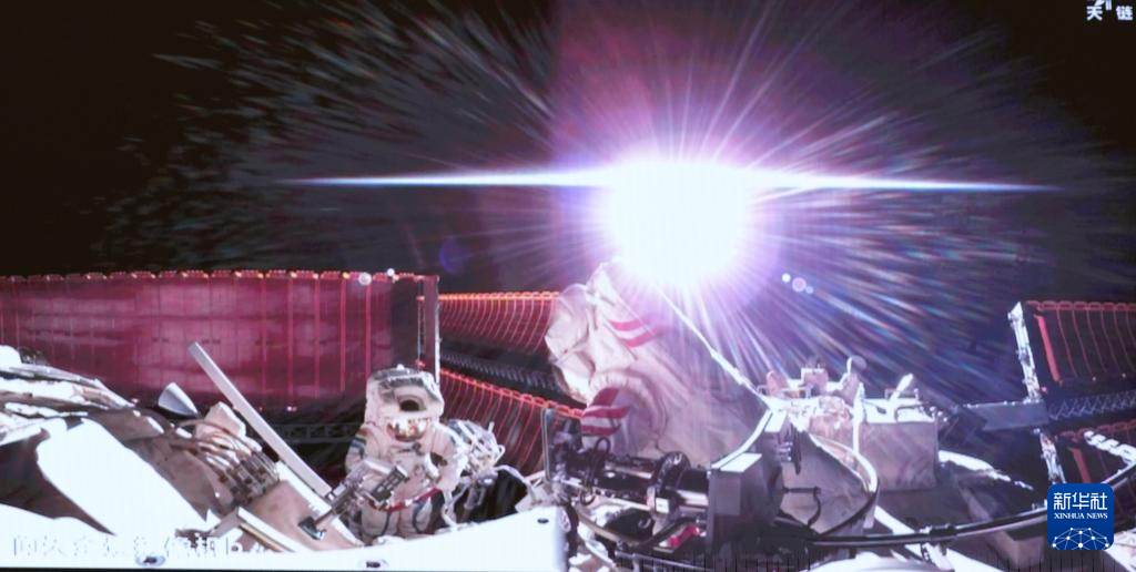 1月20日在北京航天飛行控制中心拍攝的神舟十九號航天員蔡旭哲(右)、宋令東(左)在空間站組合體艙外工作的畫面。新華社記者 劉芳 攝