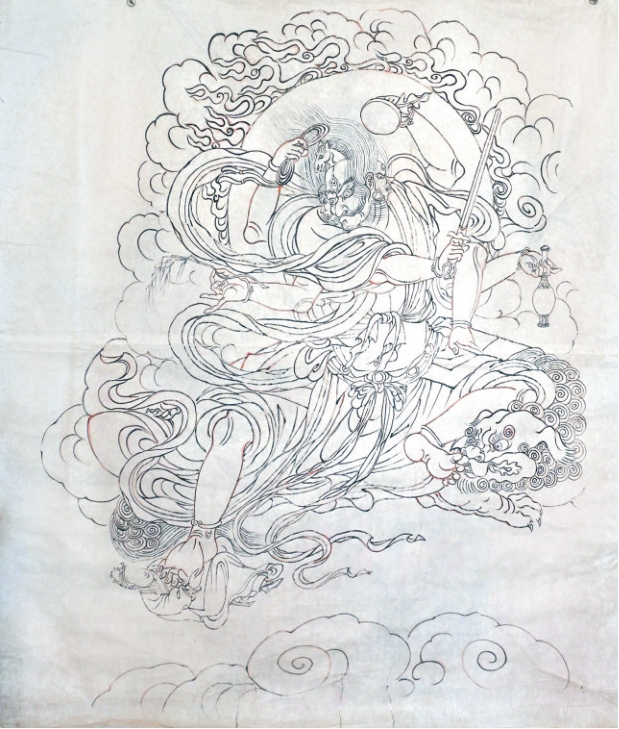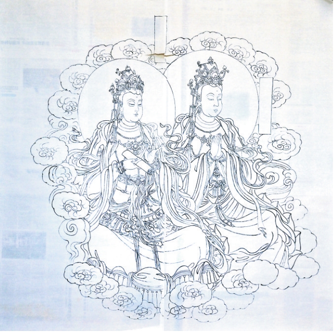 在李向東看來,臨寫是為了學(xué)習(xí)而不是“復(fù)制”壁畫。面對殘破或年久漫漶不清的畫面,他從蛛絲馬跡入手反復(fù)揣摩,根據(jù)壁畫整體的線描、造型特點(diǎn),一一補(bǔ)而畫之,最后定稿。從這個意義上說,李向東也使殘破的公主寺壁畫得以復(fù)原,“補(bǔ)壁”之功不可小覷。