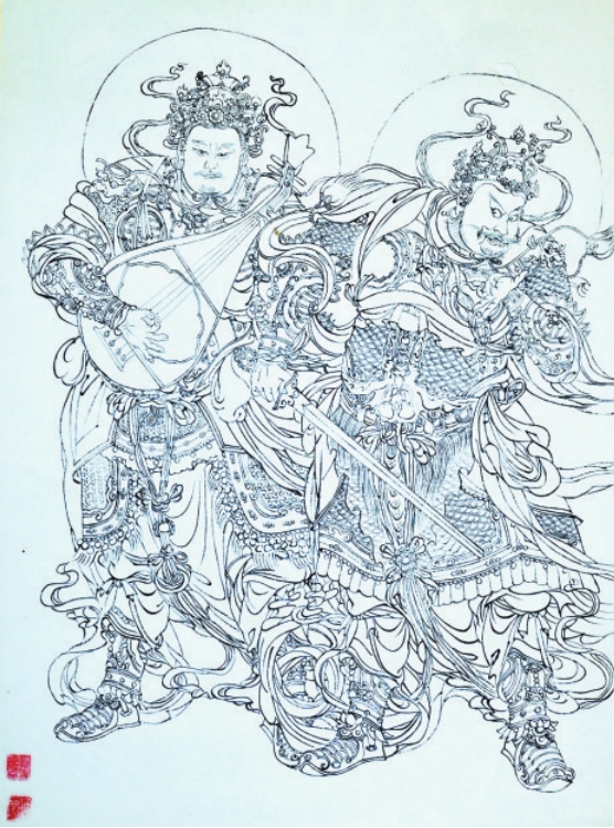 更令李向東醉心不已的是,壁畫中人物衣袖明明是靜態(tài),卻似乎被微風(fēng)吹動、卷起形成鼓動之勢,仿佛下一秒就要隨風(fēng)起舞。在靜止的壁畫中,畫師勾勒出搖動的扇面、飛舞的發(fā)絲,以及在眾仙家之間縹緲虛幻的云海,創(chuàng)造了靈動出畫的動態(tài)美。眾神佛道三五成群,看似錯落隔離,卻又遙相呼應(yīng),彼此相望,顧盼生輝,呼之欲出。在人物群像中,李向東對金剛座神的畫法最為推崇——面目粗獷,體格魁偉,毛發(fā)濃密,一雙銅鈴般的眼睛微微斜視,須眉怒張,威風(fēng)凜凜。身體重心偏向一側(cè),一手持金剛杵于肩頭,一手探掌護(hù)于胸前,全身肌肉緊繃,顯示出畫師對線條的熟練運(yùn)用和高超的造型能力。