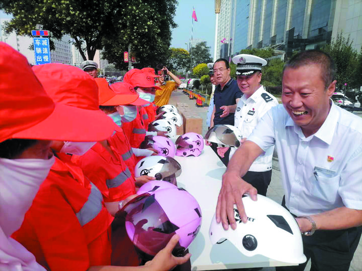 今年是我市創(chuàng)建全國(guó)文明城市的決戰(zhàn)決勝年,廣大環(huán)衛(wèi)工人一直默默奮斗在崗位上,為我市創(chuàng)文不斷努力。市公安局交警支隊(duì)始終牽掛著奮戰(zhàn)在基層一線(xiàn)的環(huán)衛(wèi)工人,支隊(duì)以此次贈(zèng)送頭盔活動(dòng)為契機(jī),持續(xù)關(guān)心關(guān)愛(ài)環(huán)衛(wèi)工人的生命安全和身體健康。市公安局交警支隊(duì)負(fù)責(zé)人表示:“環(huán)衛(wèi)工人大多騎著電動(dòng)三輪車(chē)或人力保潔車(chē)穿梭在大街小巷,機(jī)動(dòng)車(chē)道是他們的主要作業(yè)區(qū)之一,佩戴安全頭盔,可以大大增加他們的安全系數(shù)。同時(shí),環(huán)衛(wèi)等重點(diǎn)行業(yè)的示范引領(lǐng)作用,將有力帶動(dòng)市民遵紀(jì)守法、安全出行,為文明城市創(chuàng)建打造一道亮麗的風(fēng)景線(xiàn)。”圖為捐贈(zèng)活動(dòng)現(xiàn)場(chǎng)。張志遠(yuǎn) 攝影報(bào)道