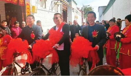 婚禮當(dāng)天,杜家寨社區(qū)兩委班子陪著新郎官一起,騎上老式帶大梁的自行車(chē)。新郎官身上披紅掛彩喜氣洋洋,車(chē)上挽著大紅花,在鄉(xiāng)親們的簇?fù)砗屯L(fēng)鑼鼓隊(duì)的陣陣鼓樂(lè)聲中,騎行來(lái)到新娘子的家中,把美麗的新娘子抱在自行車(chē)后座的紅墊子上,熱熱鬧鬧地娶回了家。