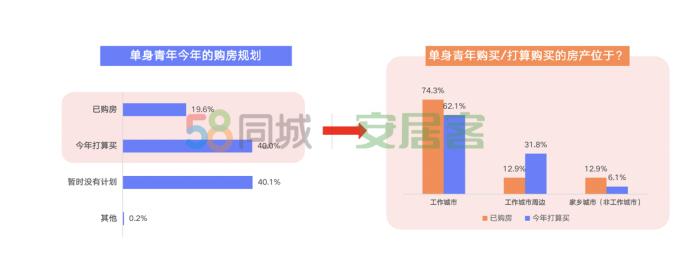 報(bào)告顯示,單身人群中有19.6%的人表示目前已購房。他們之中,選擇在工作城市買房的單身青年占比74.3%,在工作城市周邊買房的人群占比12.9%,另有12.8%的已購房單身青年回到家鄉(xiāng)城市(非工作城市)買房。