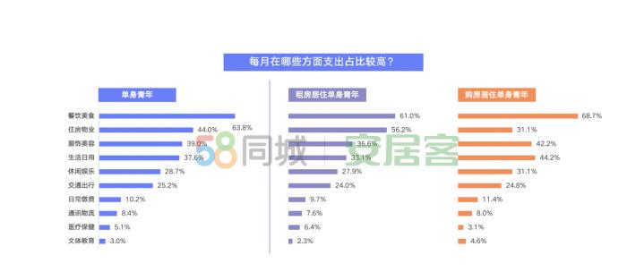 吃,是一大生活樂趣來源。報(bào)告顯示,63.8%的單身青年表示每月在餐飲美食上的花銷占比較高。此外,住房物業(yè)、服飾美容、生活日用等方面也是單身青年的主要開銷。