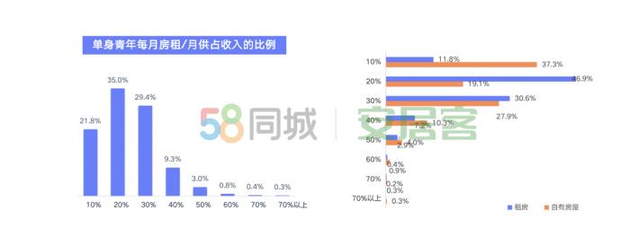 同時(shí),還有50.1%的單身青年目前租房居住,居住成本是一筆不小的支出項(xiàng),約65%的單身青年每月在房租/月供的開銷占收入的20-30%。