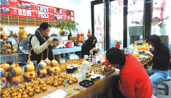 在工作室內(nèi),手工藝人侯晉麗正專注地為葫蘆彩繪。她介紹說(shuō):“我們制作的每一件葫蘆雕刻作品都需要多重工序,從篩選葫蘆到刮皮、晾曬、浸泡、拋光,再到依形構(gòu)思、打稿設(shè)計(jì),最后經(jīng)過(guò)線刻、浮雕等精雕細(xì)琢與上色收尾,每一個(gè)工序都考驗(yàn)著我們的耐心與功力。”