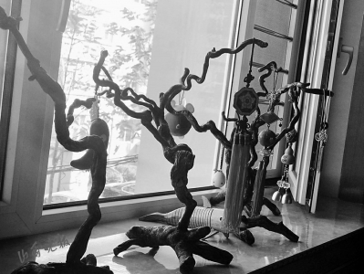 見到牛鳴遠(yuǎn)時(shí),他正忙著在家中的陽臺上懸掛兩個(gè)大樹枝。“這是棗樹枝,還有點(diǎn)濕,得掛起來晾干后才能再進(jìn)行加工。”牛鳴遠(yuǎn)說,朋友收拾平遙老家的房子時(shí),砍了院子里的大棗樹,知道他喜歡根雕,就專門運(yùn)回來一些送給他。