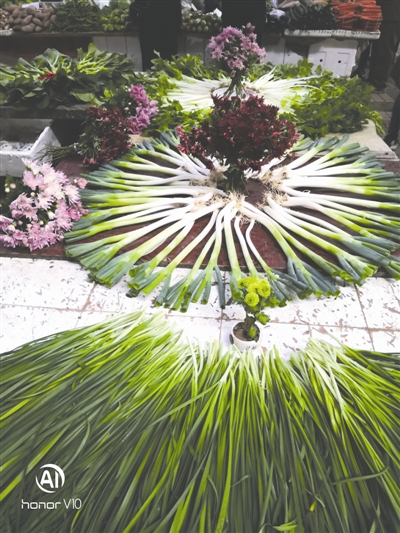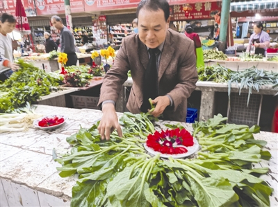 “那時孩子在成都理工大學上學,家里經(jīng)濟壓力很大?!?年前,王美成接替妻子開始在城區(qū)賣菜,他發(fā)現(xiàn)有時菜并不好賣?!坝幸淮挝胰ゾ频陞⒓友鐣吹骄频昀镉械牟似费b飾挺好看,我就想是不是也可以把花裝飾在菜攤上。嘗試之后發(fā)現(xiàn)效果挺好,大家都喜歡。”