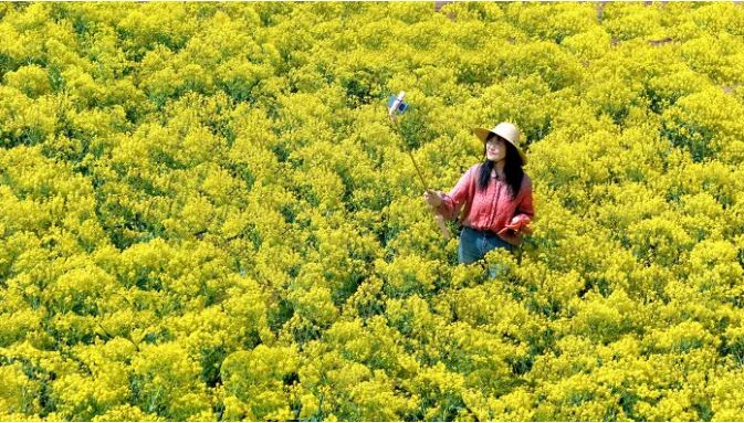 伴隨著春風,成片的板藍根花,不時泛起層層漣漪,蜂飛蝶舞,宛如人間仙境,沁人心脾的花香隨風而來,令人心馳神往,吸引不少游人。