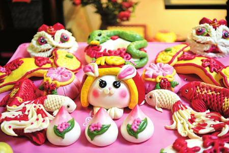 “生肖青蛇臥盤(pán),雙春蛇年生機(jī)盎然;醒獅賀歲,歲歲平安;花開(kāi)富貴葫蘆,福祿到家;可愛(ài)的醒獅兔,蛇盤(pán)兔代代富;平安扣青枝上盛開(kāi)梅花,寓意花開(kāi)富貴、孕育希望、生機(jī)盎然;可愛(ài)福袋,寓意代代有福、福氣滿滿;大紅錦鯉寓意好運(yùn)連連……”馮秀說(shuō),今年的花饃圍繞“金蛇送?!边@一主題,設(shè)計(jì)了近20個(gè)品種,每款花饃都寓意吉祥和美好祝福。每一款非遺花饃的創(chuàng)意都是基于傳統(tǒng)文化,都是對(duì)傳統(tǒng)文化的致敬,也是人們對(duì)美好生活的期待和向往,“過(guò)年買(mǎi)花饃是吃在嘴里的年味兒,充滿了幸福感,我的花饃顧客來(lái)自全國(guó)各地,有的連續(xù)多年定制,成為了老朋友?!?/p>