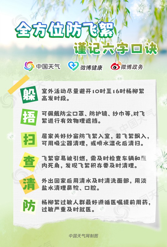 京津冀楊柳絮飄飛可持續(xù)至5月,飛絮中或攜帶花粉、灰塵等多種過敏原,被人體吸入后,易引發(fā)過敏性鼻炎、哮喘等疾病。飛絮如何防?如何降低過敏風(fēng)險?中國天氣網(wǎng)總結(jié)了躲、捂、掃、查、清、防6字口訣,助你全方位防護(hù)飛絮。