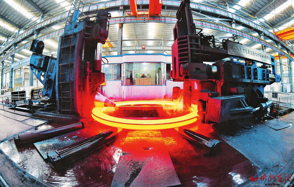 智能數(shù)控全自動徑軸向輾環(huán)機(jī)正在進(jìn)行輾環(huán)作業(yè)。 張晉蘭攝