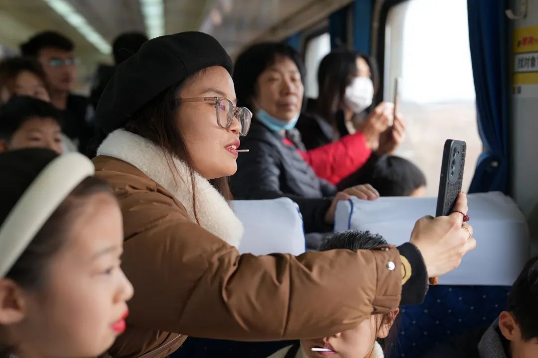 列車駛出運城站,工作人員開始為旅客熱心介紹打卡拍照的最佳地點和周邊的名勝古跡,并且精心準(zhǔn)備了小道具,方便大家打卡拍照。