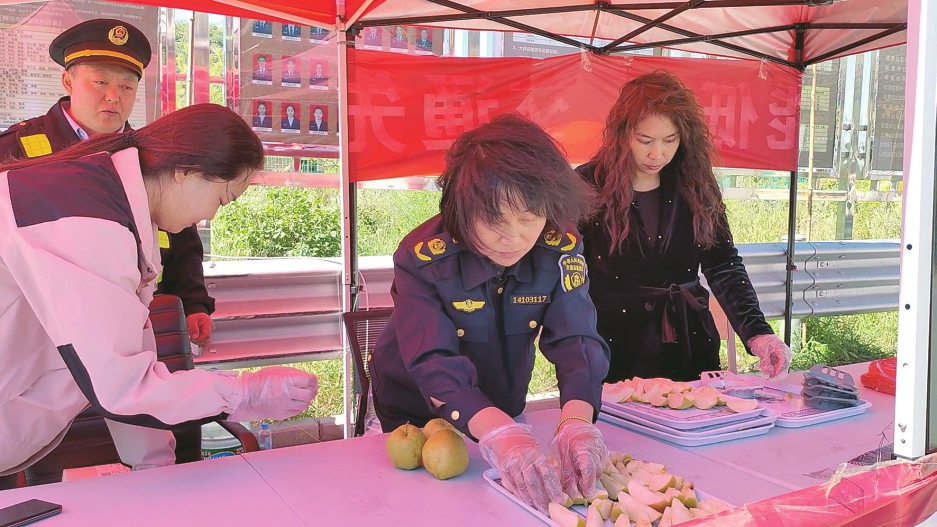 國(guó)慶長(zhǎng)假的幾天里,隰縣4個(gè)高速口設(shè)置便民服務(wù)站,游客一進(jìn)入隰縣,就能吃到當(dāng)?shù)馗刹窟f上的玉露香梨,享受免費(fèi)引導(dǎo)服務(wù)。
