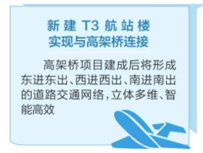 高架橋項目建成后將連接現(xiàn)有機場航站樓和新建T3航站樓、綜合交通中心及機場東路等,形成東進東出、西進西出、南進南出的道路交通網(wǎng)絡,達到立體多維、智能高效的交通疏導目標,實現(xiàn)便捷、快速進出機場的功能。