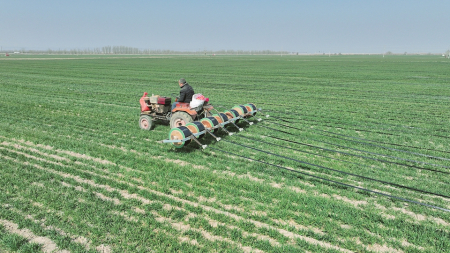 范建榮種植小麥150畝,依靠大禹渡灌區(qū)黃灌水作為澆灌來(lái)源?!胞溩訚擦舜喝畬?duì)面望糧山?!狈督s說(shuō),這句晉南農(nóng)諺中的“春三水”,指的是春季農(nóng)田要澆灌的三輪水,其中第一輪水叫“返青水”,就是小麥返青關(guān)鍵期澆灌的水。
