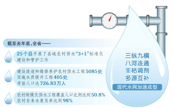 截至去年底,全省25個縣開展了縣域農(nóng)村供水“3+1”標(biāo)準(zhǔn)化建設(shè)和管護工作;建設(shè)改造和維修養(yǎng)護農(nóng)村供水工程5085處,實施水質(zhì)提升工程405處,受益人口達726.83萬人;農(nóng)村規(guī)?;┧こ谈采w人口比例達到50.8%,農(nóng)村自來水普及率達到98%。
