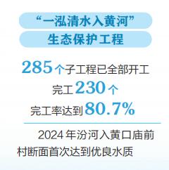 與此同時,我省牢記習近平總書記寄予山西“一泓清水入黃河”的殷切期盼,2023年6月,啟動了“一泓清水入黃河”生態(tài)保護工程,計劃用三年時間,對黃河的第二大支流——汾河,進行全流域、全方位治理。“一泓清水入黃河”生態(tài)保護工程在聚焦水質改善目標的基礎上,銜接水網建設、防洪能力提升、黑臭水體治理等多種類型,通過上下游、干支流、左右岸、水陸域一體謀劃,治污、調水、清淤、增濕、綠岸一體實施,取得了初步的生態(tài)效益、社會效益、經濟效益。如今,285個子工程已完工230個、完工率達到80.7%。