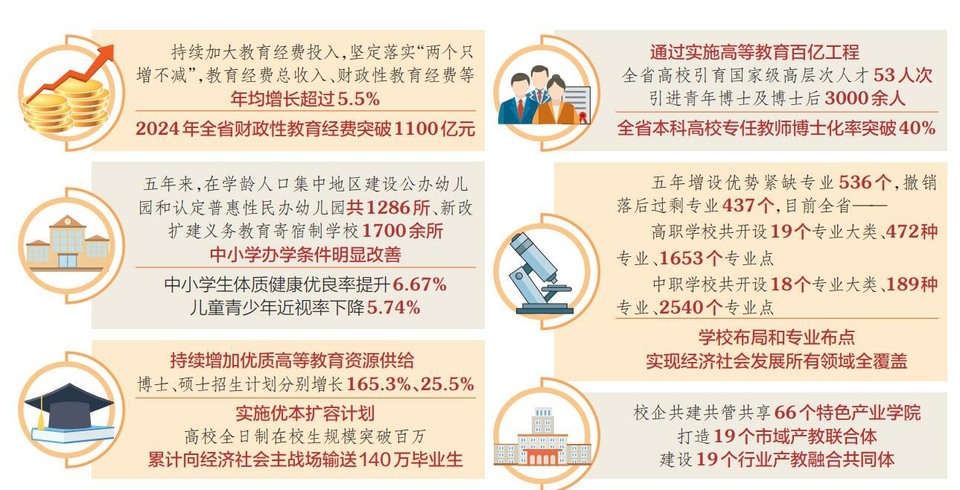 省委教育工委書記,省教育廳黨組書記、廳長(zhǎng)馬駿介紹,“十四五”期間,我省持續(xù)加大教育經(jīng)費(fèi)投入,堅(jiān)定落實(shí)“兩個(gè)只增不減”,教育經(jīng)費(fèi)總收入、財(cái)政性教育經(jīng)費(fèi)等年均增長(zhǎng)超過5.5%,2024年全省財(cái)政性教育經(jīng)費(fèi)突破1100億元。推進(jìn)基礎(chǔ)教育擴(kuò)優(yōu)提質(zhì),組建600個(gè)城鄉(xiāng)教育共同體,有序增加高中學(xué)位供給,20萬(wàn)人口以上的縣實(shí)現(xiàn)特殊教育學(xué)校全覆蓋,隨遷子女、殘疾兒童平等接受教育得到充分保障。學(xué)生資助體系實(shí)現(xiàn)學(xué)段、學(xué)校、學(xué)生全覆蓋,累計(jì)惠及1373萬(wàn)人次。今年起免除公辦幼兒園學(xué)前一年保教費(fèi),群眾的教育獲得感、幸福感持續(xù)提升。