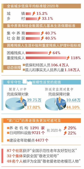 “目前,全省城鄉(xiāng)低保平均標(biāo)準(zhǔn)分別達(dá)到每人每月669元、555元,已有11個(gè)縣(市、區(qū))實(shí)現(xiàn)城鄉(xiāng)低保標(biāo)準(zhǔn)相統(tǒng)一?!笔∶裾d黨組書記、廳長(zhǎng)李建紅介紹,我省建立最低生活保障標(biāo)準(zhǔn)與人均消費(fèi)支出掛鉤的動(dòng)態(tài)調(diào)整機(jī)制,從2022年起,各縣(市、區(qū))城鄉(xiāng)低保標(biāo)準(zhǔn)分別按當(dāng)?shù)厣夏甓瘸青l(xiāng)居民人均消費(fèi)支出的30%—40%和45%—55%確定。