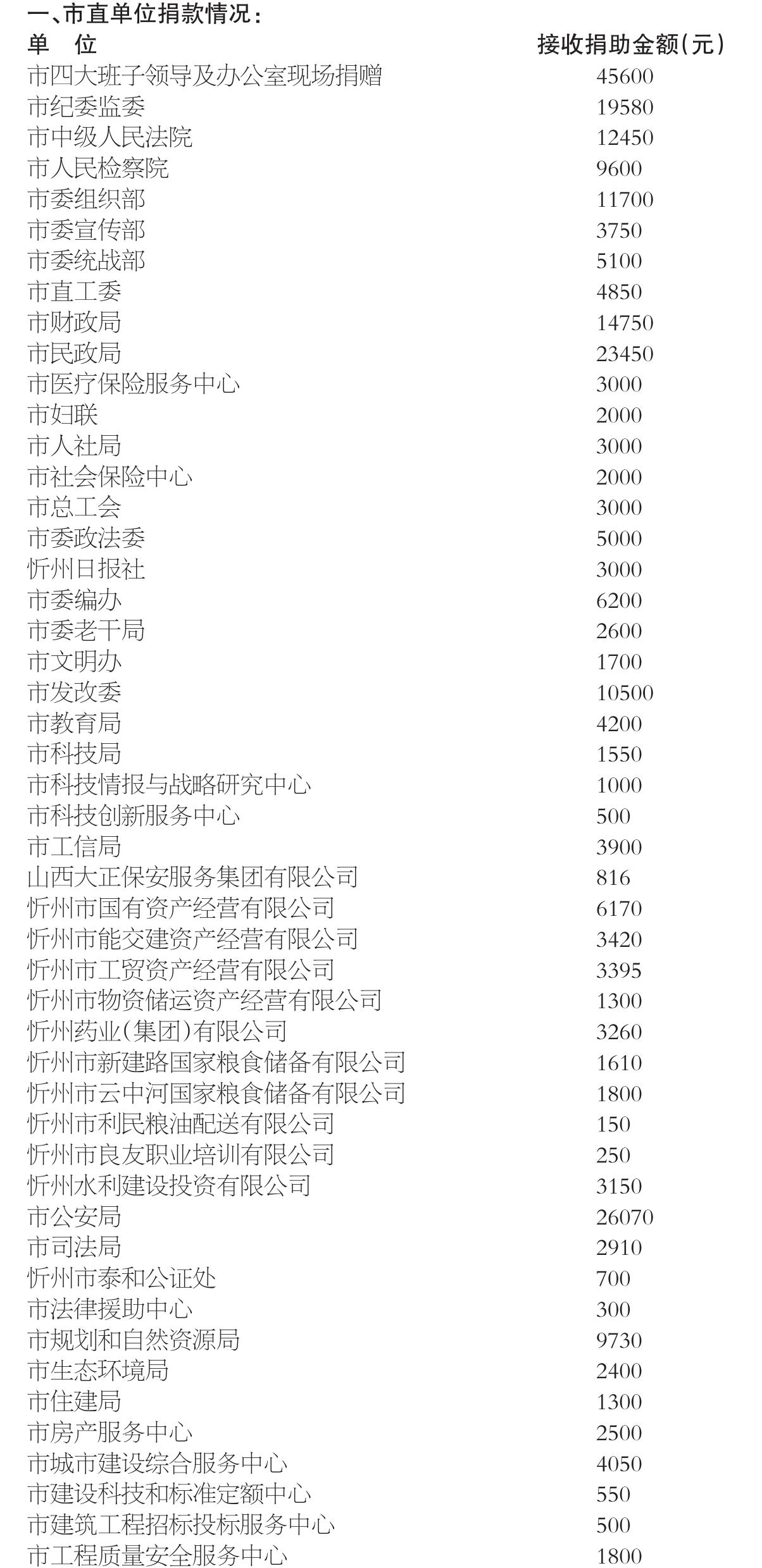 2024年11月22日,市委、市政府辦公室發(fā)出《關(guān)于開展“送溫暖、獻(xiàn)愛心”社會(huì)捐助活動(dòng)的通知》,市四大班子領(lǐng)導(dǎo)和機(jī)關(guān)干部率先垂范,各縣(市、區(qū))、各單位高度重視,認(rèn)真組織,廣大干部職工積極響應(yīng),“送溫暖、獻(xiàn)愛心”社會(huì)捐助活動(dòng)有效開展。截至2025年4月底,市直140個(gè)單位組織干部職工參與捐助,共捐款766388元,各縣(市、區(qū))接收捐款338.09萬元,合計(jì)捐款4147288元,為解決全市人民群眾的生產(chǎn)生活問題起到了積極作用?,F(xiàn)將捐助情況公告如下(市直單位以捐助時(shí)間先后為序):