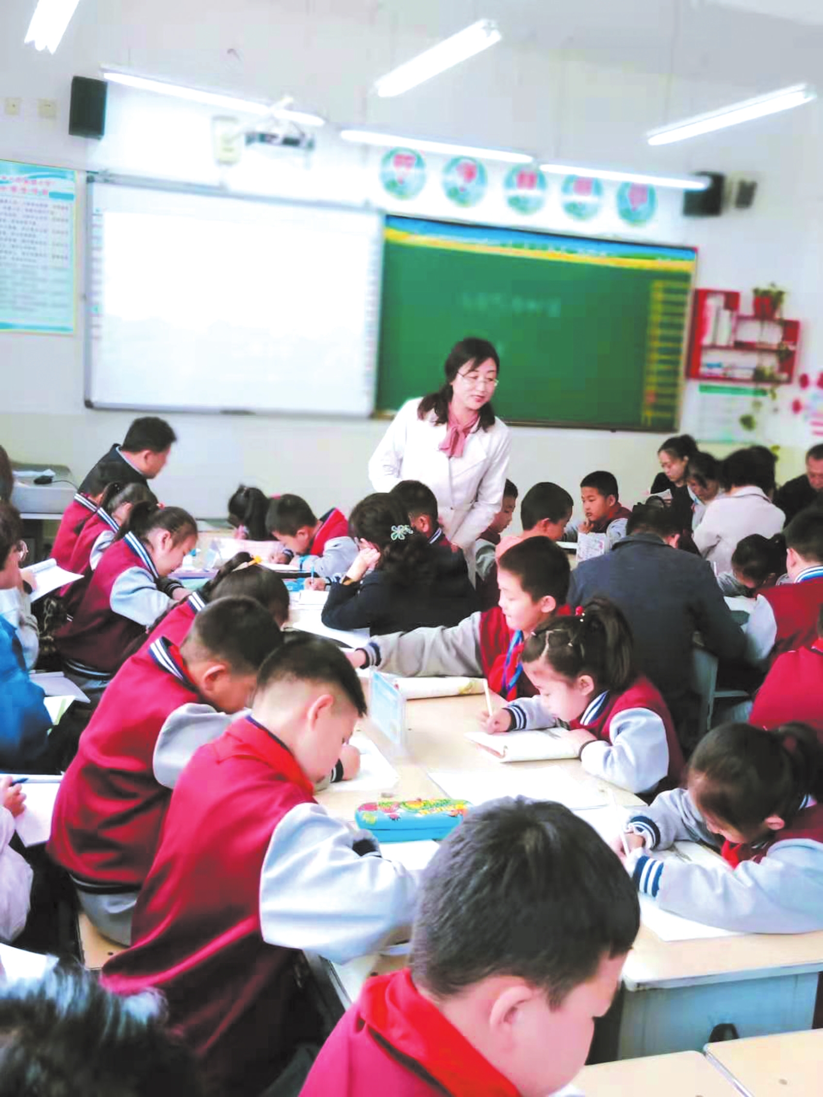 在學(xué)校的公開課,授課老師與學(xué)生及聽課的家長交流互動(dòng)。