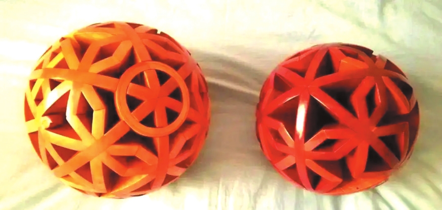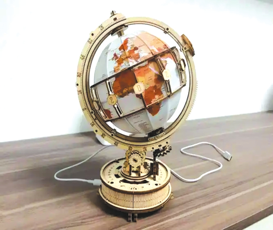 “沒用一顆釘子、一滴膠水,我們利用了榫卯技藝,讓108塊形狀各異的木構(gòu)件緊密連接,構(gòu)成一個(gè)鏤空的地球,祈盼世界團(tuán)結(jié)、人類和平?!薄堕久挠钪妗肪巹?、忻州王爾文玩(魯班鎖、孔明鎖)(以下簡稱“王爾文玩”)傳統(tǒng)木作技藝非物質(zhì)文化遺產(chǎn)代表性傳承人趙永功說。