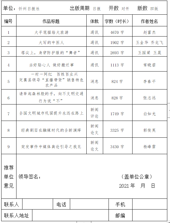 經(jīng)忻州日?qǐng)?bào)社編委會(huì)研究決定,以下作品擬推薦申評(píng)第三十屆山西新聞獎(jiǎng),現(xiàn)予以公示。有反對(duì)意見者,請(qǐng)將反對(duì)意見書面報(bào)至統(tǒng)籌部。 忻州日?qǐng)?bào)社 2021年3月26日 山西新聞獎(jiǎng)報(bào)送作品目錄