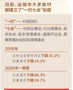 目前,運(yùn)城市大多數(shù)村都建立了“一約七會(huì)”制度——“一約”是村規(guī)民約,“七會(huì)”是村民議事會(huì)、紅白理事會(huì)、老年協(xié)會(huì)、新鄉(xiāng)賢理事會(huì)、道德評議會(huì)、禁賭禁毒協(xié)會(huì)和民調(diào)理事會(huì)。這“一約七會(huì)”制度的不斷健全,對破除鄉(xiāng)村社會(huì)陋習(xí)、引導(dǎo)群眾移風(fēng)易俗、引領(lǐng)社會(huì)新風(fēng)、化解矛盾糾紛,維護(hù)基層社會(huì)和諧穩(wěn)定起到了重要作用。村民的正能量多了,鄉(xiāng)村的負(fù)面事情少了,社會(huì)治安狀況得到明顯改善,群眾安全感顯著增強(qiáng)。2019年運(yùn)城市農(nóng)村治安案件同比下降31.2%,刑事案件下降14.3%;2020年一季度,治安案件下降86.3%,刑事案件下降59.7%。