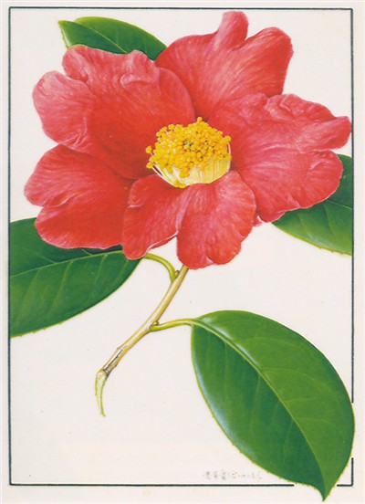 浙江山茶花 紅色花瓣明艷動人,皺褶感栩栩如生。倒卵形花瓣頂端的2裂、深綠葉片發(fā)亮的革質感以及邊緣的鋸齒都得到完整表現(xiàn),不愧是經(jīng)典之作。馮晉庸繪
