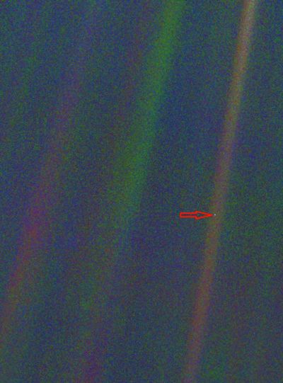 旅行者1號(hào)拍攝的太陽(yáng)系中的暗淡藍(lán)點(diǎn)兒——地球。