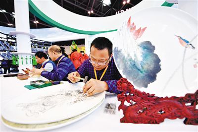第四屆山西文化產(chǎn)業(yè)博覽交易會上的刻瓷工藝展示。新華社發(fā)