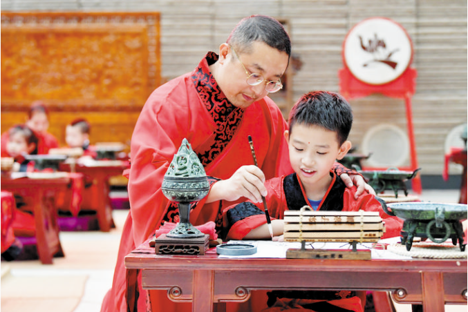 9月13日,一場漢服“開筆禮”在西安大唐西市博物館舉行,多名孩童著漢服,行漢禮,通過“朱砂開智”“啟蒙描紅”等環(huán)節(jié)體驗中國傳統(tǒng)文化。圖為家長帶領(lǐng)孩子一起進(jìn)行“啟蒙描紅”。 新華社記者 劉瀟 攝