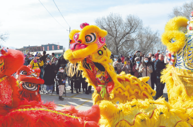 2月19日,一場群眾文化主題活動在內蒙古自治區(qū)呼和浩特市回民區(qū)莫尼山非遺小鎮(zhèn)舉行,吸引許多游客體驗觀賞,感受傳統(tǒng)文化的魅力。圖為在呼和浩特市回民區(qū)莫尼山非遺小鎮(zhèn),民間藝人表演舞獅。 (新華社發(fā) 王 正 攝)