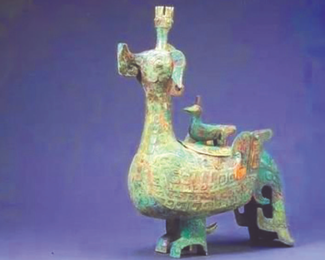 第二件是北京保利藝術(shù)博物館從海外購回、2004年曾名噪一時的“倗季鳳鳥尊”。它也是一只昂首挺立的鳳鳥形象,鳳鳥背部挺立一只小鳥。蓋內(nèi)側(cè)有銘文“倗季乍祖考寶彝”。2005年“中國十大考古新發(fā)現(xiàn)”山西絳縣橫水墓地的發(fā)掘和研究,證實(shí)了古倗國就在山西南部。那么,“倗季鳳鳥尊”的出土地也應(yīng)該是山西無疑了。