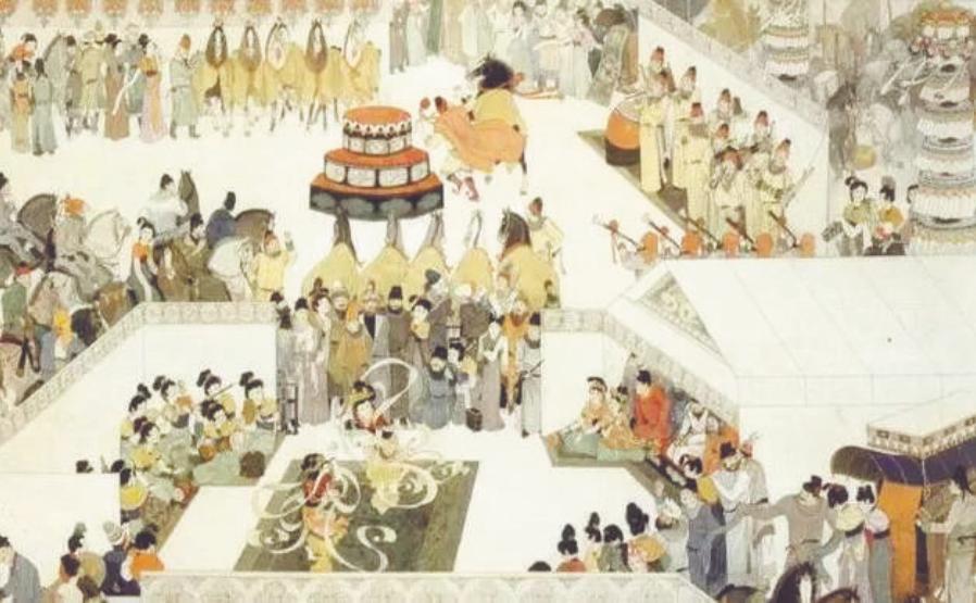 據(jù)張說《請八月五日為千秋節(jié)表》一文中所述,千秋節(jié)節(jié)俗活動主要分廟堂與民間兩個層面。千秋節(jié)前后,朝廷官員“休假三日”,有三天法定假期。千秋節(jié)當(dāng)天,天色未明之時,“金吾引駕騎,北衙四軍陳仗,列旗幟,被金甲、短后繡袍”,禁衛(wèi)軍排出盛大儀仗。緊接著,群臣為玄宗敬上萬壽酒,進(jìn)獻(xiàn)金鏡、綬帶(取音同“壽”之意)等禮物,“獻(xiàn)甘露醇酎,上萬歲壽酒,王公戚里,進(jìn)金鏡綬帶”,玄宗亦也有回賜,“以千秋節(jié)百官獻(xiàn)賀,賜四品以上金鏡、珠囊、縑彩,賜五品以上束帛有差”。