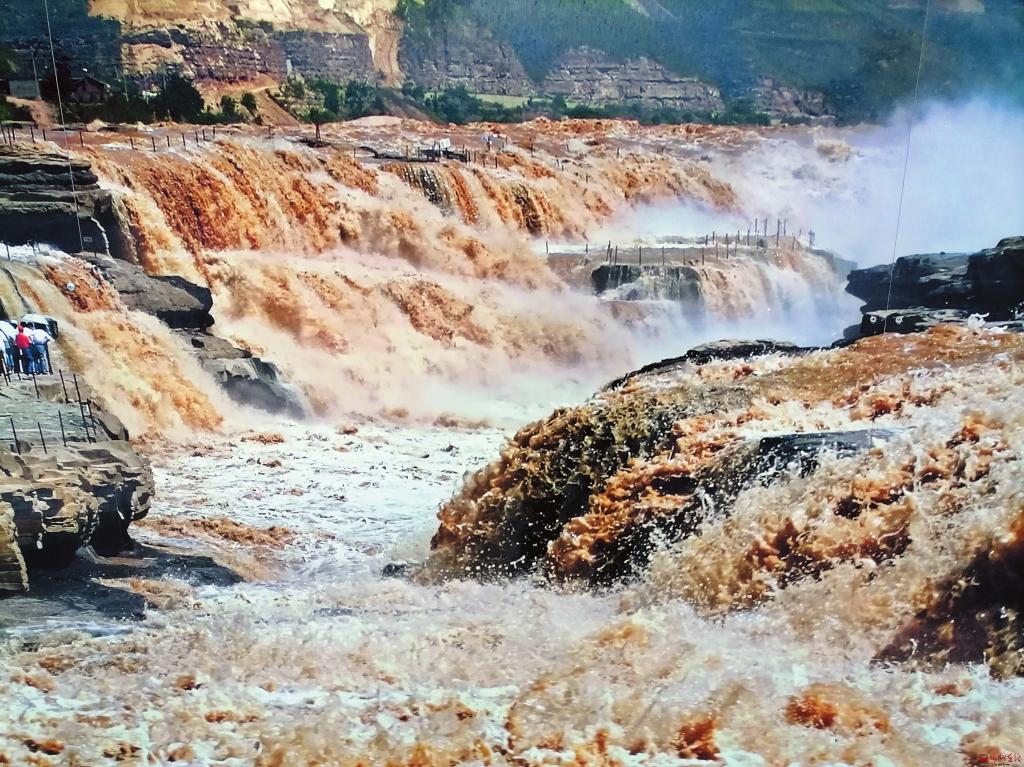 次日一大早,我獨自沿著黃河岸邊山西吉縣段向北行走,邊鍛煉身體邊觀瀑。黃河奔流至此,石壁峭立,河口收縮如壺口,故名。河面壓縮到二三十米,每秒一千立方米的河水,從二十多米高的陡崖上傾注而瀉,形成“千里黃河一壺收”的壯美景象。壺口瀑布是國家5A級風景名勝區(qū),東瀕山西省吉縣壺口鎮(zhèn),西臨陜西省宜川縣壺口鎮(zhèn),為兩省共有的旅游景區(qū)。一瀑布連二省,同名同鎮(zhèn),秦晉之好,傳為佳話。