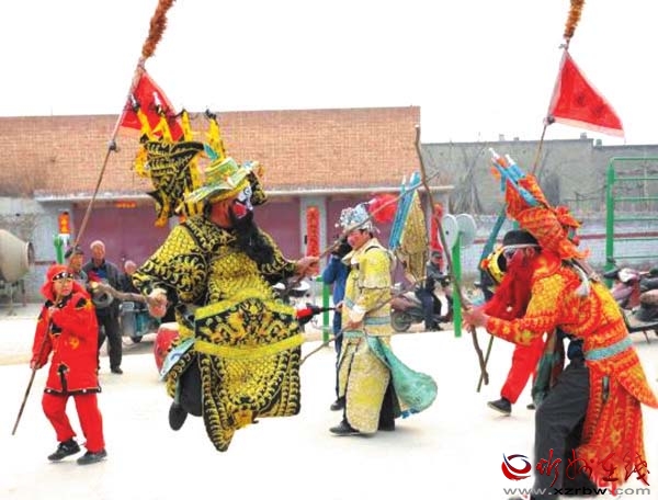 令人欣喜的是,今年的社火表演增加了很多新鮮血液,最小的表演者只有11歲。72歲的社火老藝人梁生偉是總教練,第十四代傳承人李軍平是演員兼教練。在他們帶領(lǐng)下,每一次演出從召集、化妝、著裝、配飾、道具,到列隊、祭旗、出征、行軍,以及演出中的傳丁、練兵、探馬、布陣、對壘、決戰(zhàn)、破陣等,每一個細節(jié)都有講究、說法和規(guī)矩。其行為規(guī)范貫穿著樸素的古代儒家哲學(xué)思想,其陣法擺出的是玄妙的古代軍事戰(zhàn)陣,如對打表演的是北宋楊繼業(yè)楊家軍的武術(shù)套路,鼓樂擊打出的是原始戰(zhàn)鼓石破天驚的鼓點風(fēng)格,給人以極大的歷史韻味和藝術(shù)享受。
