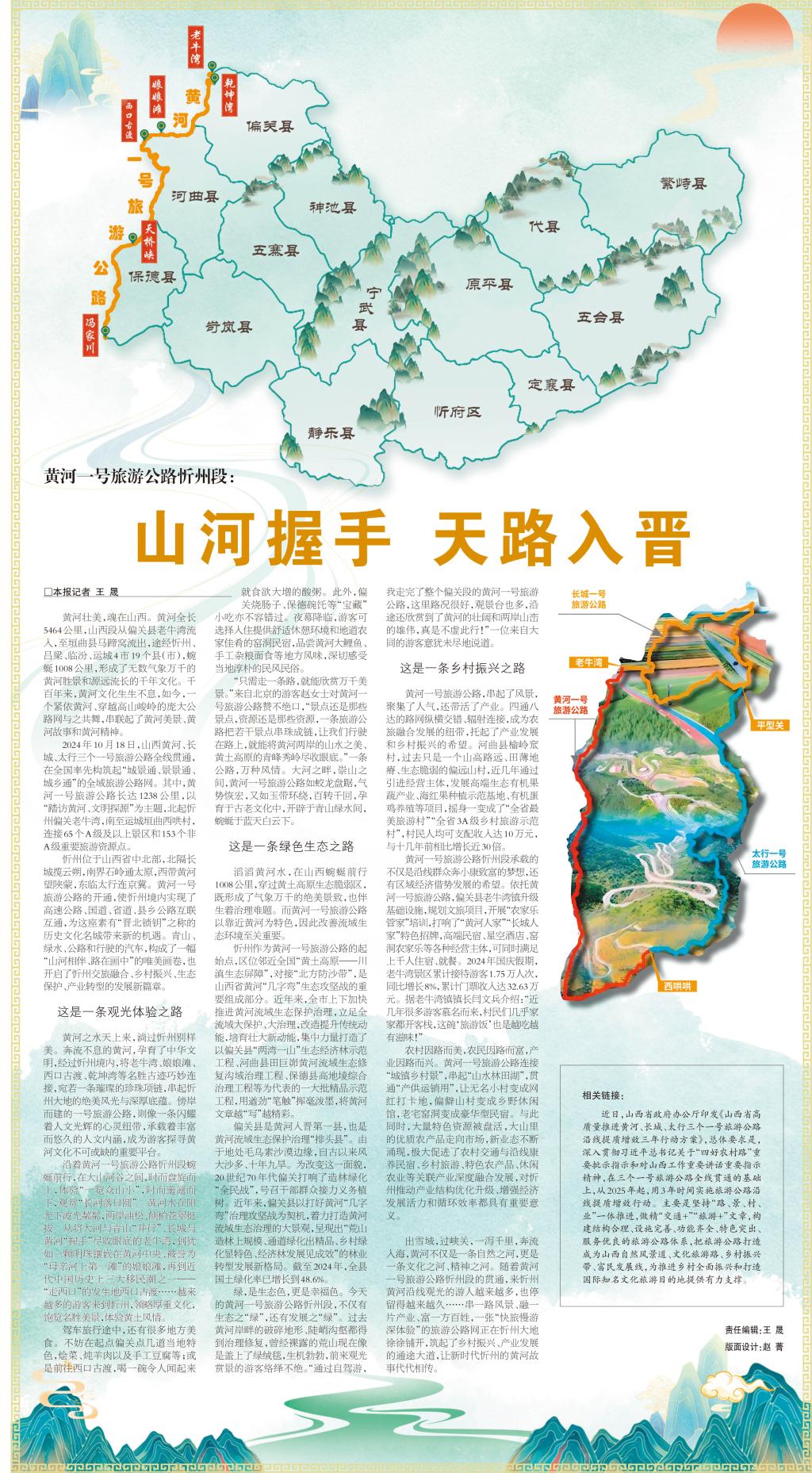 黃河壯美,魂在山西。黃河全長(zhǎng)5464公里,山西段從偏關(guān)縣老牛灣流入,至垣曲縣馬蹄窩流出,途經(jīng)忻州、呂梁、臨汾、運(yùn)城4市19個(gè)縣(市),蜿蜒1008公里,形成了無數(shù)氣象萬千的黃河勝景和源遠(yuǎn)流長(zhǎng)的千年文化。千百年來,黃河文化生生不息,如今,一個(gè)緊依黃河、穿越高山峻嶺的龐大公路網(wǎng)與之共舞,串聯(lián)起了黃河美景、黃河故事和黃河精神。 2024年10月18日,山西黃河、長(zhǎng)城、太行三個(gè)一號(hào)旅游公路全線貫通,在全國率先構(gòu)筑起“城景通、景景通、城鄉(xiāng)通”的全域旅游公路網(wǎng)。其中,黃河一號(hào)旅游公路長(zhǎng)達(dá)1238公里,以“踏訪黃河、文明探源”為主題,北起忻州偏關(guān)老牛灣,南至運(yùn)城垣曲西哄村,連接65個(gè)A級(jí)及以上景區(qū)和153個(gè)非A級(jí)重要旅游資源點(diǎn)。 忻州位于山西省中北部,北隔長(zhǎng)城攬?jiān)扑罚辖缡瘞X通太原,西帶黃河望陜蒙,東臨太行連京冀。黃河一號(hào)旅游公路的開通,使忻州境內(nèi)實(shí)現(xiàn)了高速公路、國道、省道、縣鄉(xiāng)公路互聯(lián)互通,為這座素有“晉北鎖鑰”之稱的歷史文化名城帶來新的機(jī)遇。青山、綠水、公路和行駛的汽車,構(gòu)成了一幅“山河相伴、路在畫中”的唯美畫卷,也開啟了忻州交旅融合、鄉(xiāng)村振興、生態(tài)保護(hù)、產(chǎn)業(yè)轉(zhuǎn)型的發(fā)展新篇章。 這是一條觀光體驗(yàn)之路 黃河之水天上來,淌過忻州別樣美。奔流不息的黃河,孕育了中華文明,經(jīng)過忻州境內(nèi),將老牛灣、娘娘灘、西口古渡、乾坤灣等名勝古跡巧妙連接,宛若一條璀璨的珍珠項(xiàng)鏈,串起忻州大地的絕美風(fēng)光與深厚底蘊(yùn)。傍岸而建的一號(hào)旅游公路,則像一條閃耀著人文光輝的心靈紐帶,承載著豐富而悠久的人文內(nèi)涵,成為游客探尋黃河文化不可或缺的重要平臺(tái)。 沿著黃河一號(hào)旅游公路忻州段蜿蜒前行,在大山河谷之間,時(shí)而盤旋而上,體驗(yàn)“一覽眾山小”,時(shí)而迤邐而下,觀賞“長(zhǎng)河落日?qǐng)A”。黃河水在陽光下波光粼粼,兩岸油松、側(cè)柏蒼翠挺拔。從將大河與青山“并行”、長(zhǎng)城與黃河“握手”盡收眼底的老牛灣,到猶如一顆明珠鑲嵌在黃河中央、被譽(yù)為“母親河上第一灘”的娘娘灘,再到近代中國歷史上三大移民潮之一——“走西口”的發(fā)生地西口古渡……越來越多的游客來到忻州,領(lǐng)略厚重文化,飽覽名勝美景,體驗(yàn)黃土風(fēng)情。 駕車旅行途中,還有很多地方美食。不妨在起點(diǎn)偏關(guān)點(diǎn)幾道當(dāng)?shù)靥厣?,燴菜、燉羊肉以及手工豆腐等;或是前往西口古渡,喝一碗令人聞起來就食欲大增的酸粥。此外,偏關(guān)燒腸子、保德碗饦等“寶藏”小吃亦不容錯(cuò)過。夜幕降臨,游客可選擇入住提供舒適休憩環(huán)境和地道農(nóng)家佳肴的窯洞民宿,品嘗黃河大鯉魚、手工雜糧面食等地方風(fēng)味,深切感受當(dāng)?shù)卮緲愕拿耧L(fēng)民俗。 “只需走一條路,就能欣賞萬千美景?!眮碜员本┑挠慰挖w女士對(duì)黃河一號(hào)旅游公路贊不絕口,“景點(diǎn)還是那些景點(diǎn),資源還是那些資源,一條旅游公路把若干景點(diǎn)串珠成鏈,讓我們行駛在路上,就能將黃河兩岸的山水之美、黃土高原的青峰秀嶺盡收眼底。”一條公路,萬種風(fēng)情。大河之畔,崇山之間,黃河一號(hào)旅游公路如蛟龍盤踞,氣勢(shì)恢宏,又如玉帶環(huán)繞,百轉(zhuǎn)千回,孕育于古老文化中,開辟于青山綠水間,蜿蜒于藍(lán)天白云下。 這是一條綠色生態(tài)之路 滔滔黃河水,在山西蜿蜒前行1008公里,穿過黃土高原生態(tài)脆弱區(qū),既形成了氣象萬千的絕美景致,也伴生著治理難題。而黃河一號(hào)旅游公路以靠近黃河為特色,因此改善流域生態(tài)環(huán)境至關(guān)重要。 忻州作為黃河一號(hào)旅游公路的起始點(diǎn),區(qū)位鄰近全國“黃土高原——川滇生態(tài)屏障”,對(duì)接“北方防沙帶”,是山西省黃河“幾字彎”生態(tài)攻堅(jiān)戰(zhàn)的重要組成部分。近年來,全市上下加快推進(jìn)黃河流域生態(tài)保護(hù)治理,立足全流域大保護(hù)、大治理,改造提升傳統(tǒng)動(dòng)能,培育壯大新動(dòng)能,集中力量打造了以偏關(guān)縣“兩灣一山”生態(tài)經(jīng)濟(jì)林示范工程、河曲縣田巨峁黃河流域生態(tài)修復(fù)溝域治理工程、保德縣高地堎綜合治理工程等為代表的一大批精品示范工程,用遒勁“筆觸”揮毫潑墨,將黃河文章越“寫”越精彩。 偏關(guān)縣是黃河入晉第一縣,也是黃河流域生態(tài)保護(hù)治理“排頭縣”。由于地處毛烏素沙漠邊緣,自古以來風(fēng)大沙多、十年九旱。為改變這一面貌,20世紀(jì)70年代偏關(guān)打響了造林綠化“全民戰(zhàn)”,號(hào)召干部群眾接力義務(wù)植樹。近年來,偏關(guān)縣以打好黃河“幾字彎”治理攻堅(jiān)戰(zhàn)為契機(jī),著力打造黃河流域生態(tài)治理的大景觀,呈現(xiàn)出“荒山造林上規(guī)模、通道綠化出精品、鄉(xiāng)村綠化顯特色、經(jīng)濟(jì)林發(fā)展見成效”的林業(yè)轉(zhuǎn)型發(fā)展新格局。截至2024年,全縣國土綠化率已增長(zhǎng)到48.6%。 綠,是生態(tài)色,更是幸福色。今天的黃河一號(hào)旅游公
