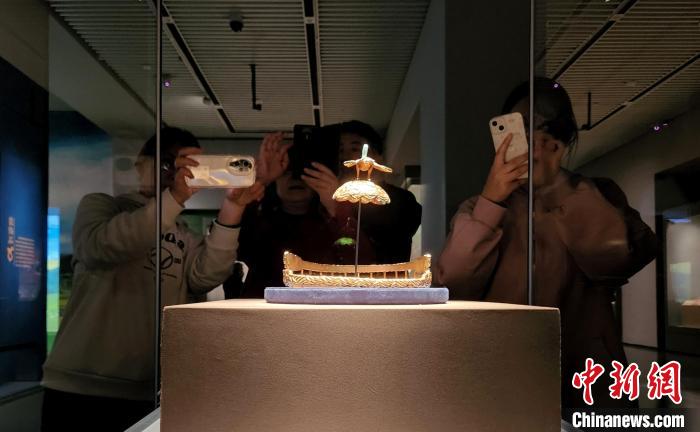 在山東博物館鄂爾多斯青銅文明展現(xiàn)場(chǎng),觀眾欣賞匈奴鷹頂金冠。趙曉 攝