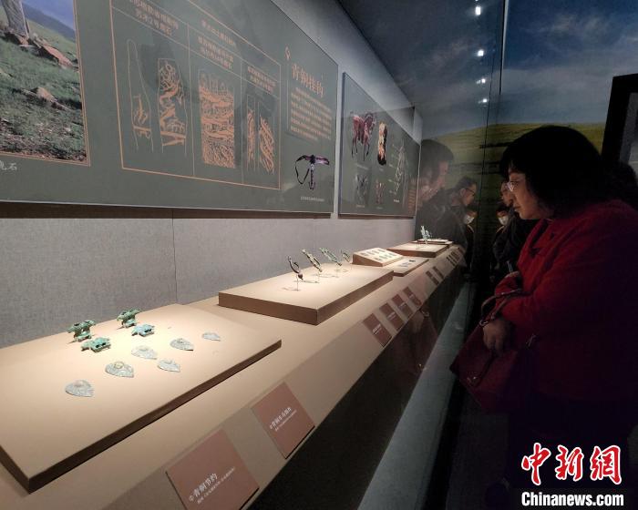 記者在展廳內(nèi)看到,眾多青銅制品以動(dòng)物形象為裝飾題材,猛虎、野狼、駿馬、鷹隼等姿態(tài)奔放、形象生動(dòng),折射游牧民族對(duì)生命力的崇拜。