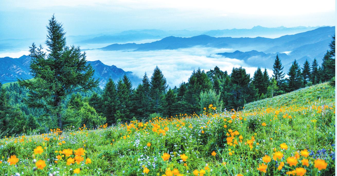 駝梁地形四周封閉,中為谷地,形成了山巒綿亙、溝壑縱橫、河川橫跨東西的自然生態(tài)景觀。其主峰海拔2281米,為“晉冀兩省四縣”交匯處,駝峰山巒蜿蜒,此起彼伏,猶如“靜臥巨駝”而取名駝梁。與五臺(tái)山風(fēng)景名勝區(qū)東北相望,遙相呼應(yīng),有其獨(dú)特和不可替代之優(yōu)勢(shì),同為五臺(tái)山旅游資源亮點(diǎn)。由山谷到山頂分布著落葉林混交林帶、樺樹(shù)林帶、落葉松林帶,生物垂直分布變化明顯。駝梁頂部,有一片亞高山草甸,約近萬(wàn)畝的茵茵綠草,像碩大無(wú)比的地毯,與天際交接,一望無(wú)垠。隱于藍(lán)天白云和松林綠波之間,散落著漫山遍野的杜鵑花、金蓮花、百合花、燈籠花等,置身其間,如進(jìn)花海,恍若仙境。因位于云霧縹緲的高山之巔,故被人譽(yù)為“云頂花?!?。
