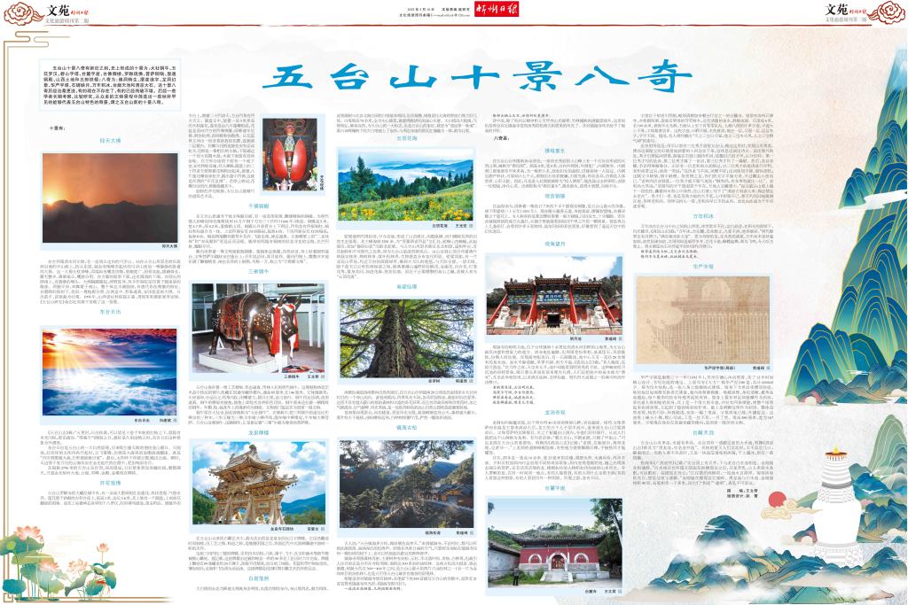 五臺(tái)山十景八奇有新舊之別,史上形成的十景為:大社銅牛、玉花羅漢、碧山字塔、臺(tái)麓字崖、古佛牌樓、羅睺現(xiàn)佛、菩薩銅鍋、顯通銅殿、山西土地和五郎鐵棍;八奇為:佛洞轉(zhuǎn)生、摩崖造字、龍洞幻景、華嚴(yán)字塔、石罅映月、萬(wàn)年積冰、臺(tái)巔天池和清涼大石。這十景八奇歷經(jīng)滄桑更迭,有的現(xiàn)在不存在了,有的已經(jīng)殘破不堪。后經(jīng)一些學(xué)者長(zhǎng)期考察,比較研究,從眾多的文物景觀中篩選出一些世所罕見(jiàn)的能夠代表五臺(tái)山特色的奇景,謂之五臺(tái)山新的十景八奇。
