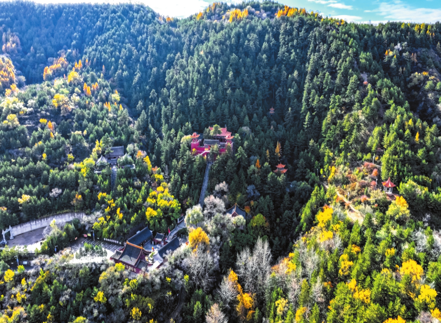 山林間宏大的廟宇建筑群始建于北魏時期,憑借清幽秀麗的自然風(fēng)光和深厚的文化底蘊(yùn),吸引了眾多高僧來此傳經(jīng)布道。隨著佛教文化的發(fā)展,與之相關(guān)的建筑藝術(shù)、雕塑藝術(shù)、壁畫藝術(shù)歷代都有發(fā)展,可惜大部分毀于戰(zhàn)火。1992年開始重建,集儒釋道于一體的廟宇群規(guī)模宏大。