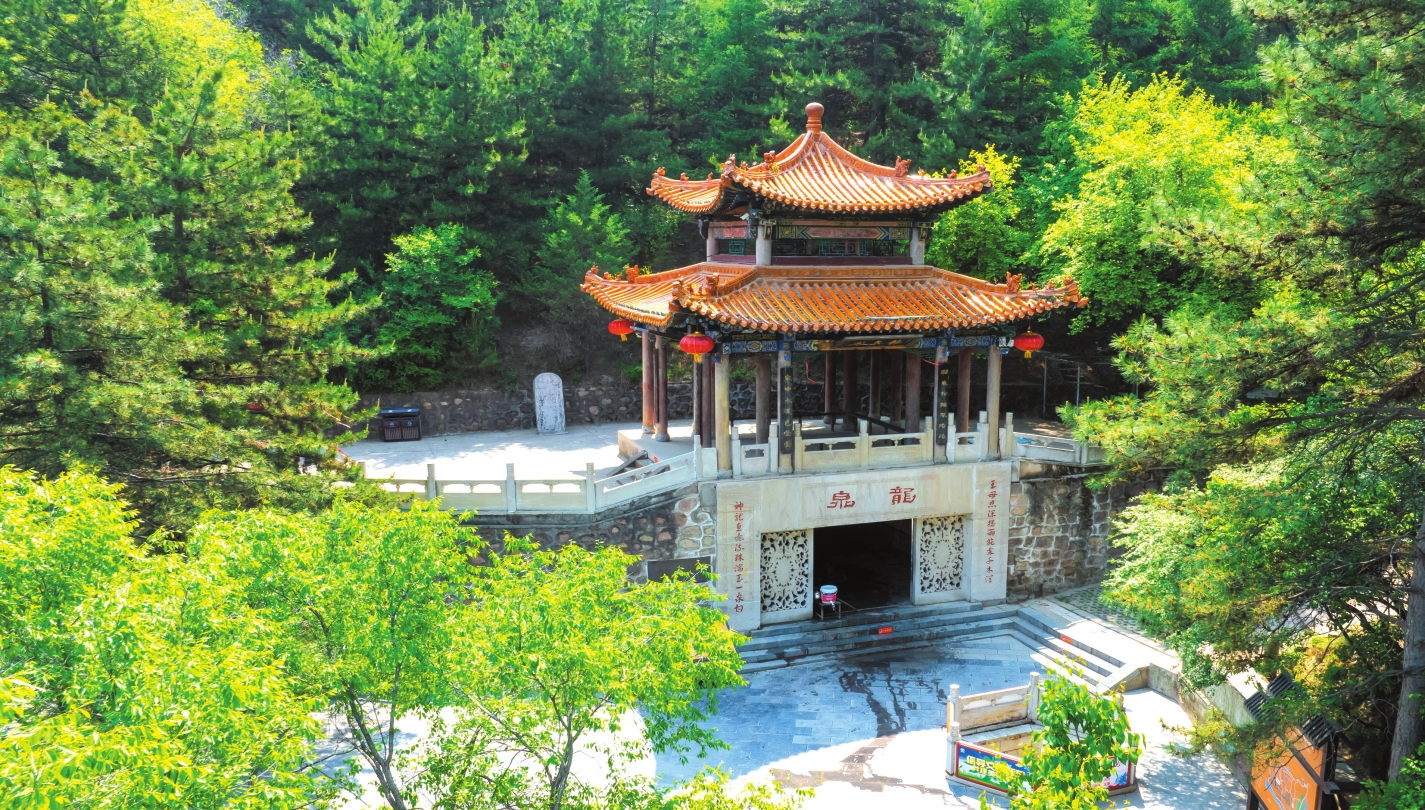 山有水而媚,土得水而沃。從大雄寶殿出來,沿著西門旁一條小道不遠(yuǎn)處,就是那片號稱“天柱松濤”的松林了。只見樹干筆直,枝條蒼勁,直指云霄,林間松脂飄香,氣息悠然。人還在松林中流連尋芳,遠(yuǎn)遠(yuǎn)就能聽到聞名已久的“天柱龍泉”在流淌。龍泉位于景區(qū)廟群西南的龍泉閣,作為“靜樂舊八景”之首的“天柱龍泉”,又名“犬舐泉”,《魏書》載:“爾朱榮高祖羽健居北秀容川。會有狗舐地,因而穿之,得甘泉,故名?!毕鄠魅谐錾颀?,故名龍泉。高山出泉是為奇觀,泉水清澈見底,旱不涸、澇不盈,夏飲清神,冬飲沁心。有“天柱圣境啟心智,龍泉奇觀令神怡”之頌。此泉水富含多種礦物質(zhì)和微量元素,是地地道道的“天然級礦泉水”。近幾年上山鍛煉的居民很多,人們上山時自帶裝水工具,攜泉水以做飯和飲用,期盼著龍泉水能給人帶來健康和好運(yùn)。站在龍泉邊,總能感受到一陣陣濕潤的水氣撲面而來,甚至像風(fēng)一樣輕繞著周身,使人置身于自然美景中不愿離開,連呼吸也變得無比暢快起來。