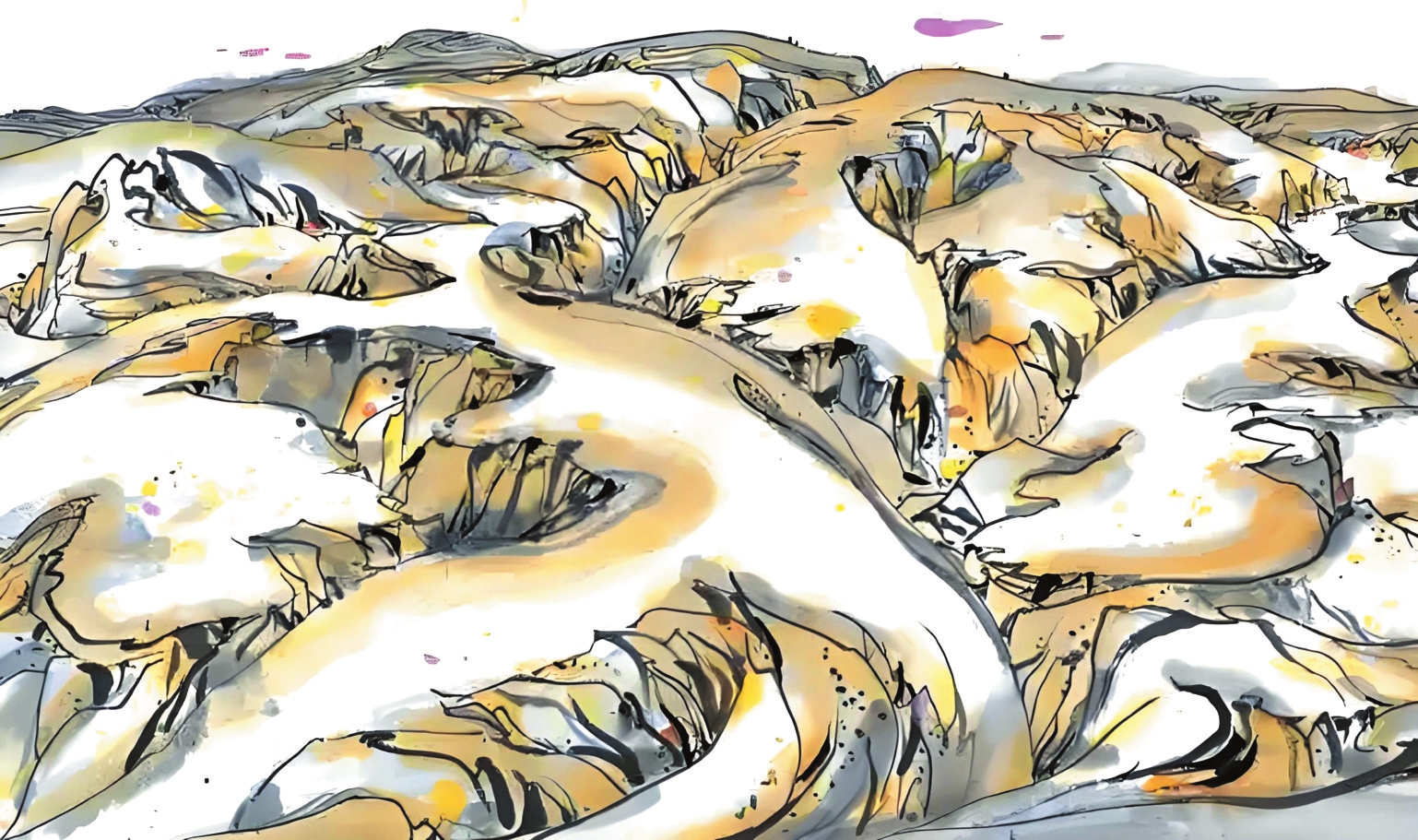 1989年10月的河曲寫生,是吳冠中藝術(shù)生涯的重要轉(zhuǎn)折點(diǎn)。在陪同的學(xué)生王秦生引導(dǎo)下,這位古稀老人尋找“黃土荒漠之典型地區(qū)”,最終駐足晉西北河曲縣。每日晨起,他面對(duì)被雨水沖刷、滿山皆溝壑的地貌,靜心思考,猛然產(chǎn)生了驚人的藝術(shù)聯(lián)想——起伏的山形如同眾多老虎,而那些溝壑恰似老虎皮毛上的斑紋。他在《出現(xiàn)老虎》一文中寫道:“我終于發(fā)現(xiàn)黃土高原是展拓了的老虎之群,其間伏臥著無(wú)數(shù)猛虎,有的正將躍起,有的還在酣睡。作完數(shù)幅黃土高原,意猶未盡,于是我畫起老虎來(lái)。”這種將地理特征轉(zhuǎn)化為藝術(shù)創(chuàng)作標(biāo)志著吳冠中完成“從風(fēng)景寫生到精神寫意”的蛻變,其價(jià)值在于為現(xiàn)代中國(guó)畫開辟了根植本土、融貫中西的新路徑。一個(gè)月河曲翠峰山寫生之旅誕生的《老虎高原》,更以極富樂感的線條勾勒出這片土地精神的圖騰。