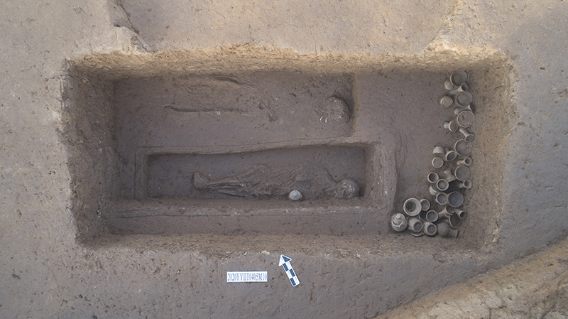 河南平頂山余莊遺址是一處規(guī)模較大的龍山時期聚落遺址,面積約50萬平方米,發(fā)現(xiàn)墓葬、房址、窖穴等各類遺跡50余處,其中龍山文化M10是迄今河南境內(nèi)已發(fā)現(xiàn)的隨葬器物數(shù)量最豐富、等級規(guī)格最高、禮制色彩最明確的龍山文化墓葬。墓葬保存完好,隨葬陶器有33件,排列有序,器類成組,呈現(xiàn)出鮮明的禮制色彩。